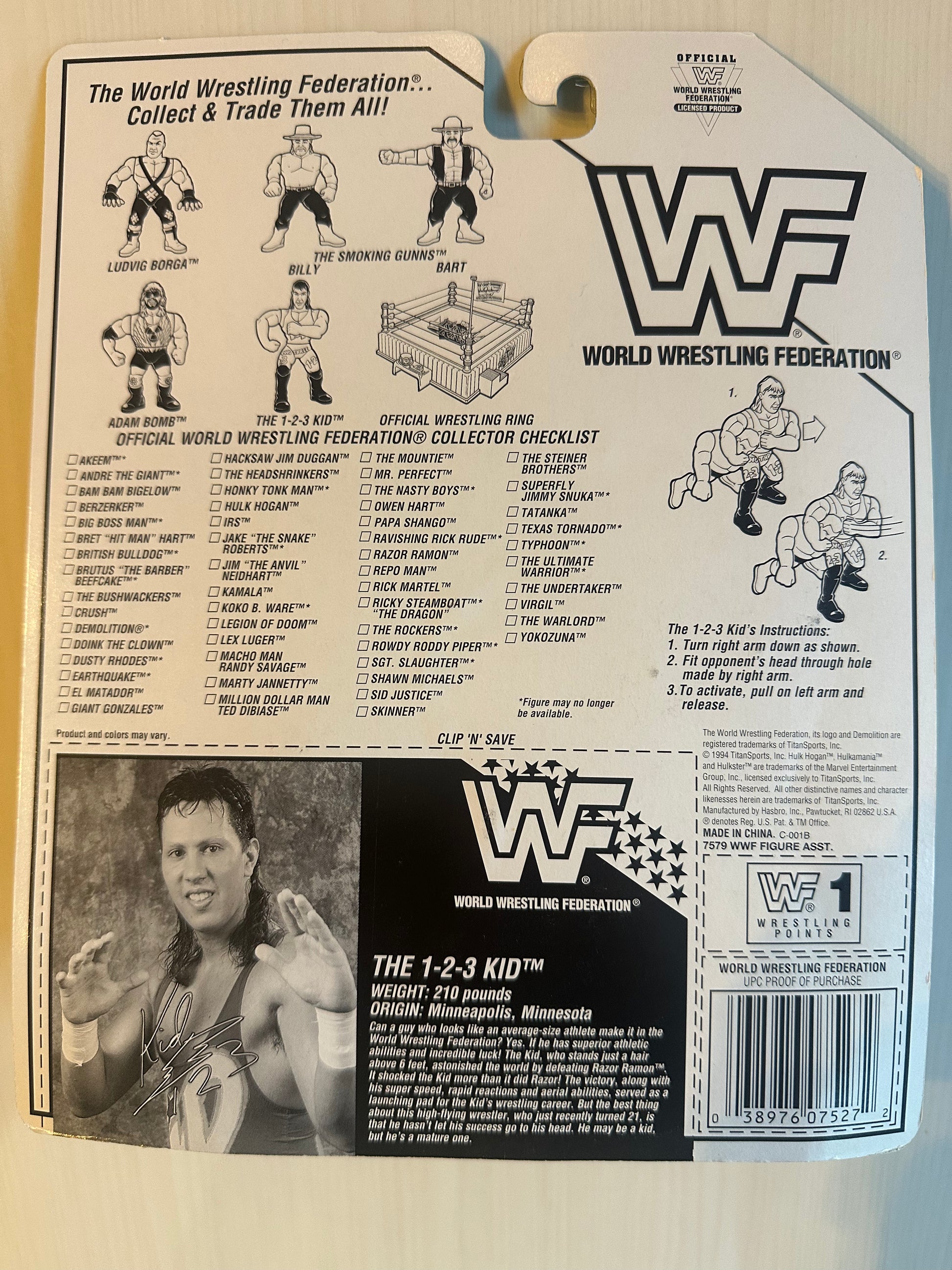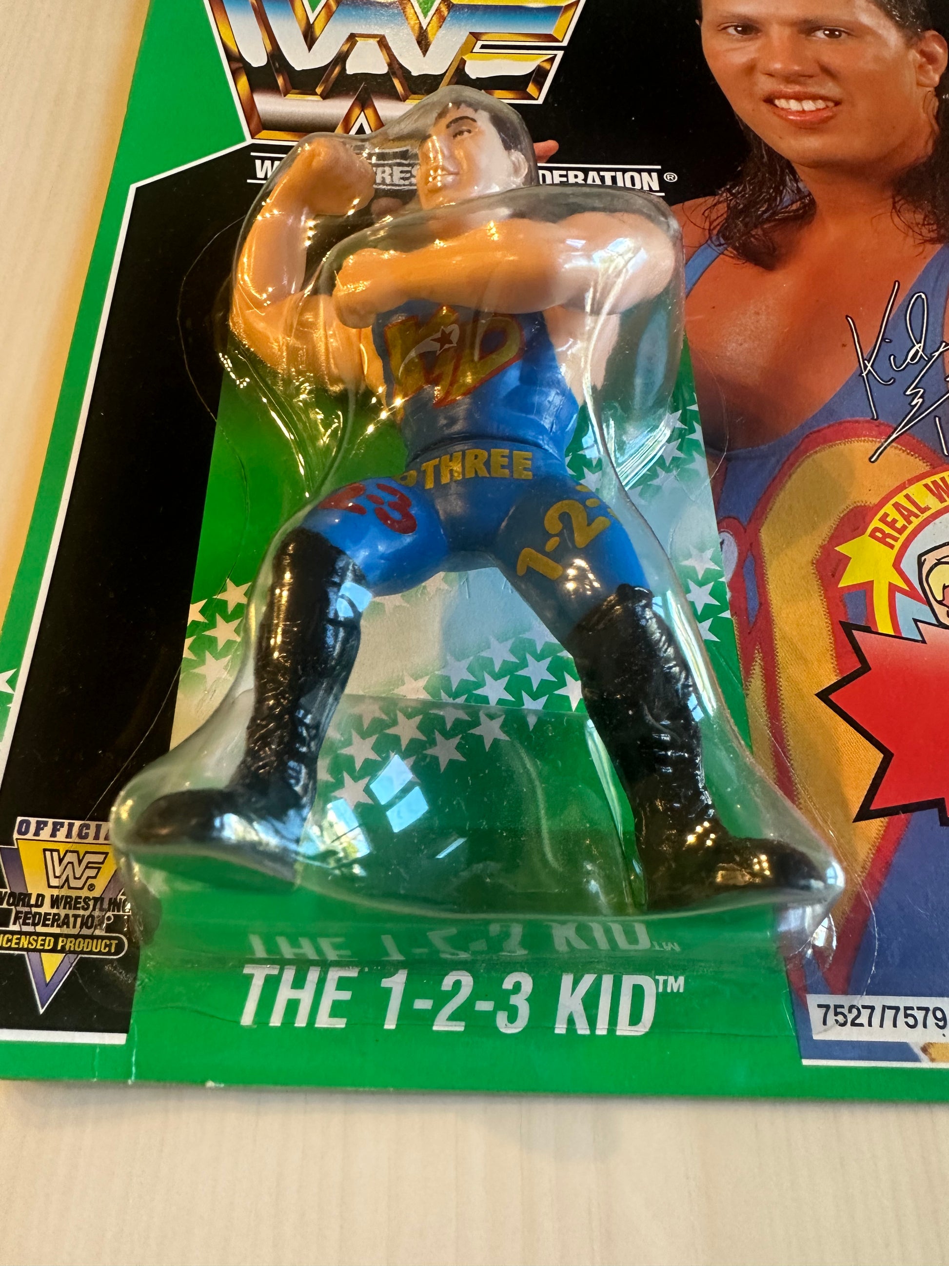 WWF HASBRO SERIES 1 1-2-3 KID GREEN CARD UNOPENED MOC MINT ON CARD WRESTLING ACTION FIGURE - One of the rarest of the whole series, the toughest to find of the greens, the 1-2-3 Kid unopened. The bubble is in excellent condition, no dents or cracks, firmly secured to the card, an excellent figure for grading. Free worldwide shipping! Please contact using the form at the bottom corner of the site if you have any questions about this item.