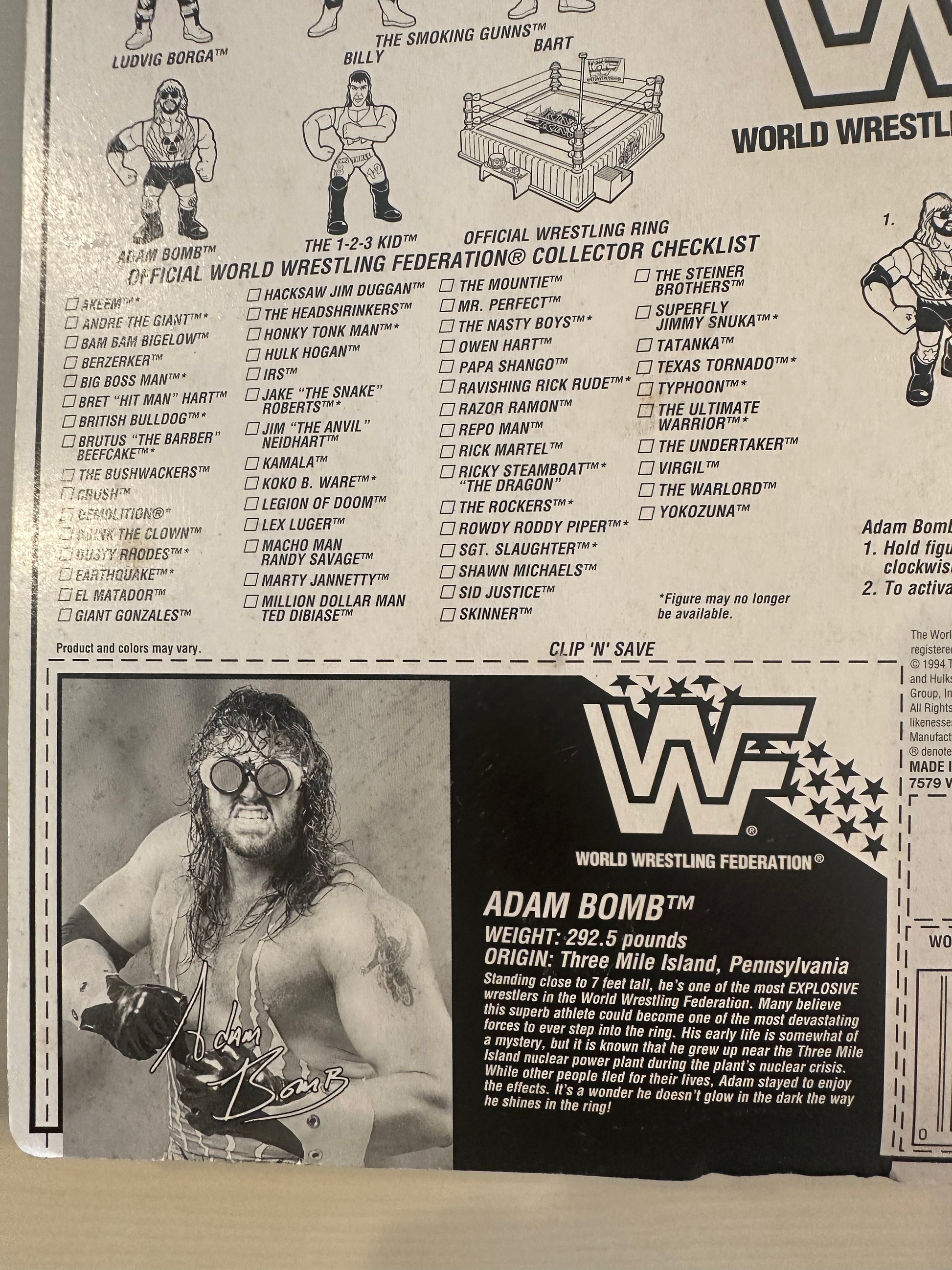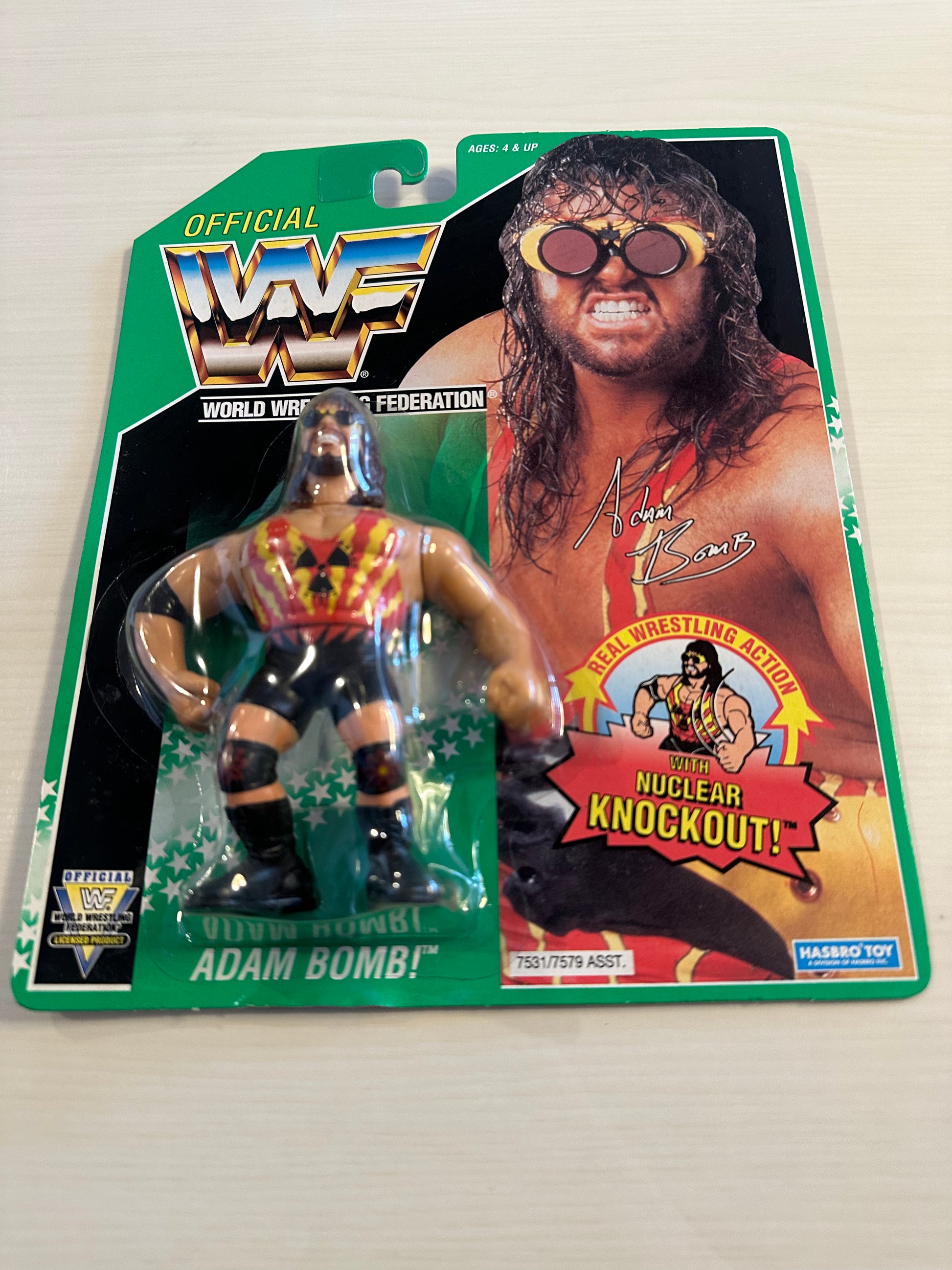 WWF HASBRO MOC MINT ON CARD ADAM BOMB SERIES 11 (GREEN CARD) ADAM BOMB - Beautiful card, sits lovely and flat on a surface. There is a minor dent in the bubble above Adam's head, but otherwise great shape. Ready to be signed by the man himself. Please view all pictures before purchase and contact us with any questions about this figure using the form at the lower right hand side of the page.
