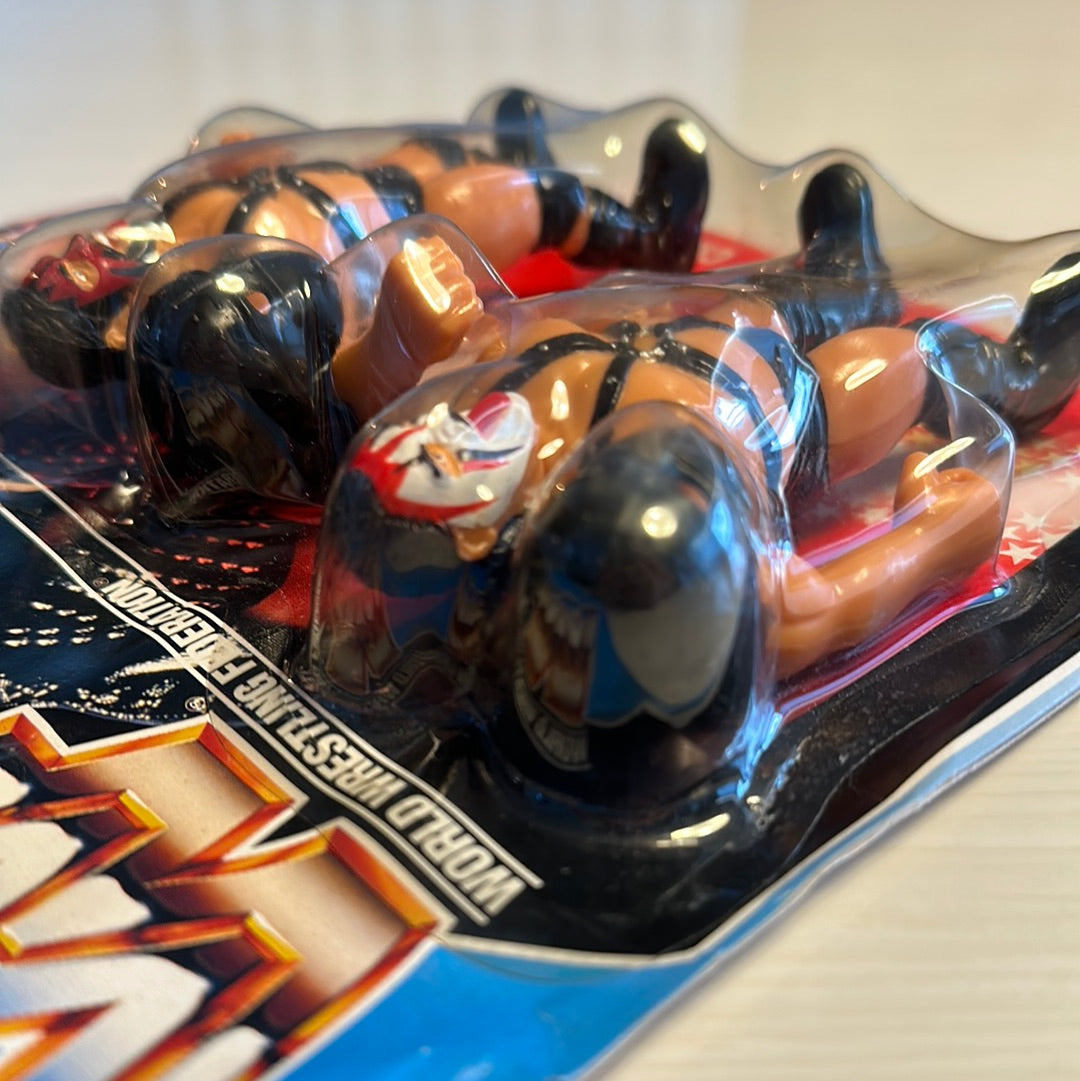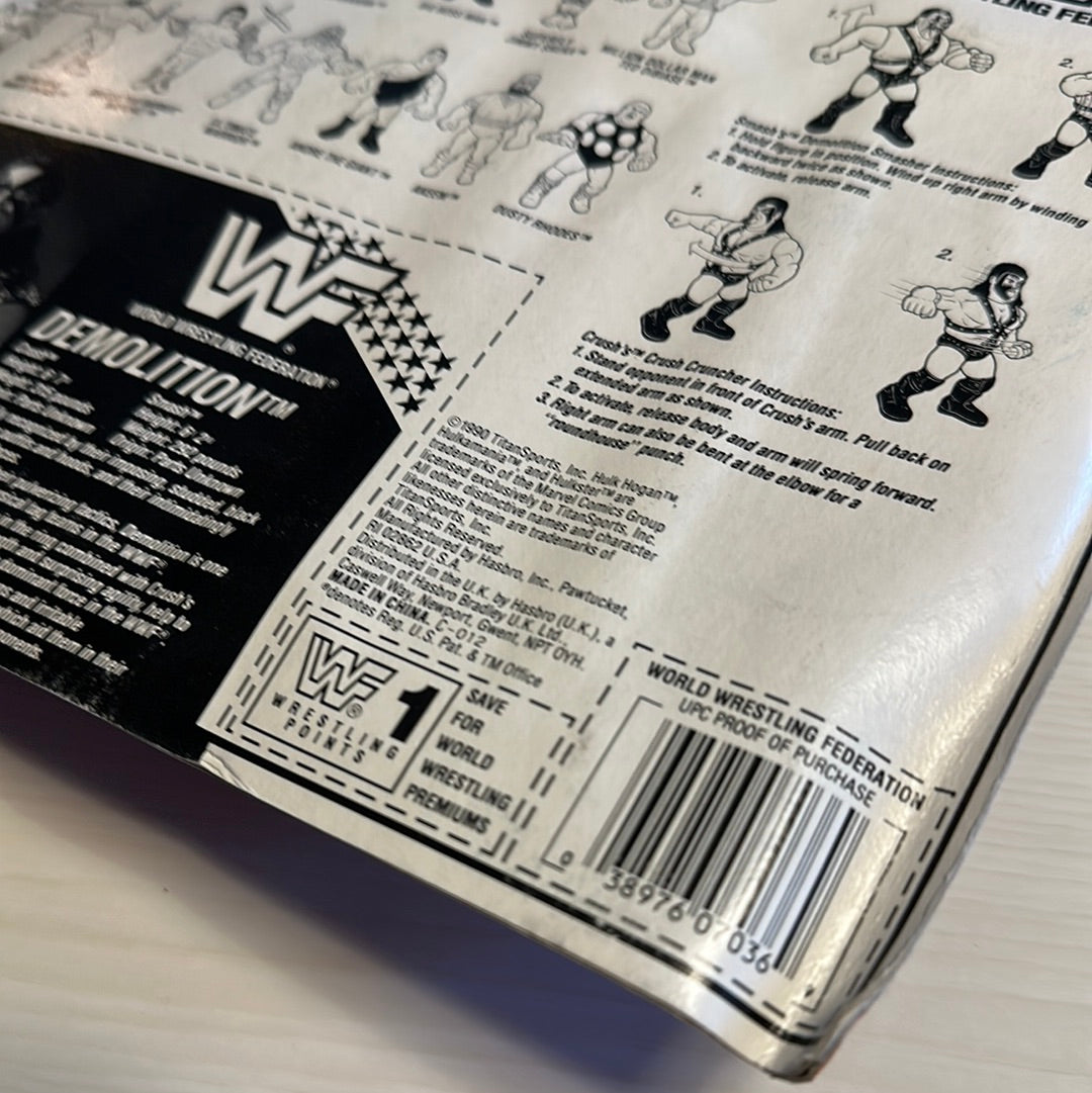 WWF HASBRO Series 2 DEMOLITION MINT ON CARD (MOC) UNOPENED WRESTLING ACTION FIGURE (TAG TEAM) - The card has some warping in various places, particularly on the left hand side of the box. Please consider this before purchasing, and check all pictures closely. The bubble is in perfect condition with no yellowing, no cracks and no dents. A few scuffs around the edge of the card. Back of the card has no stains, but the warping is also visible of the back of the card. This is a nice example of a very hard to find tag team figure set. Price includes free worldwide shipping. Please feel free to use the contact form to ask any questions.