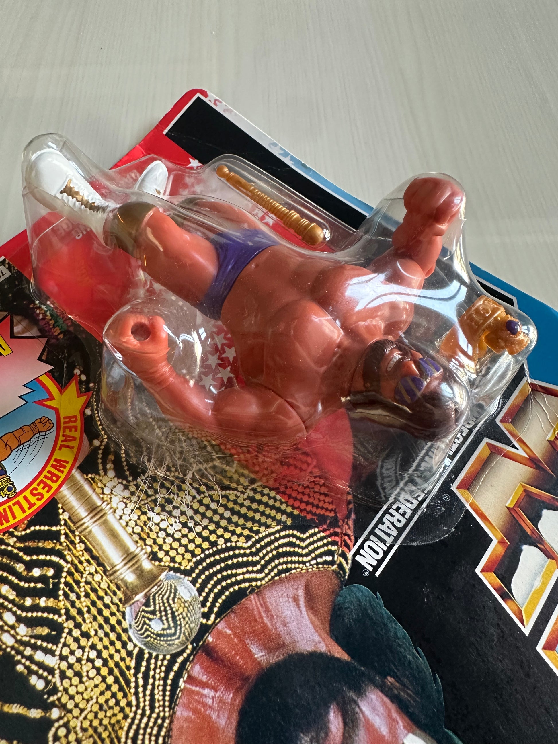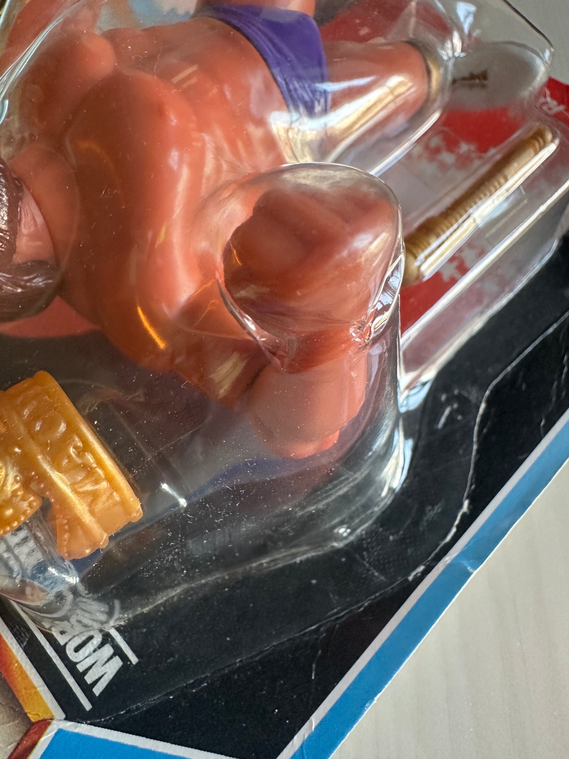 The figure has some slight folding at the edge of the card, and a small dent in the bubble as visible in the pictures. Right side of the card in good shape.