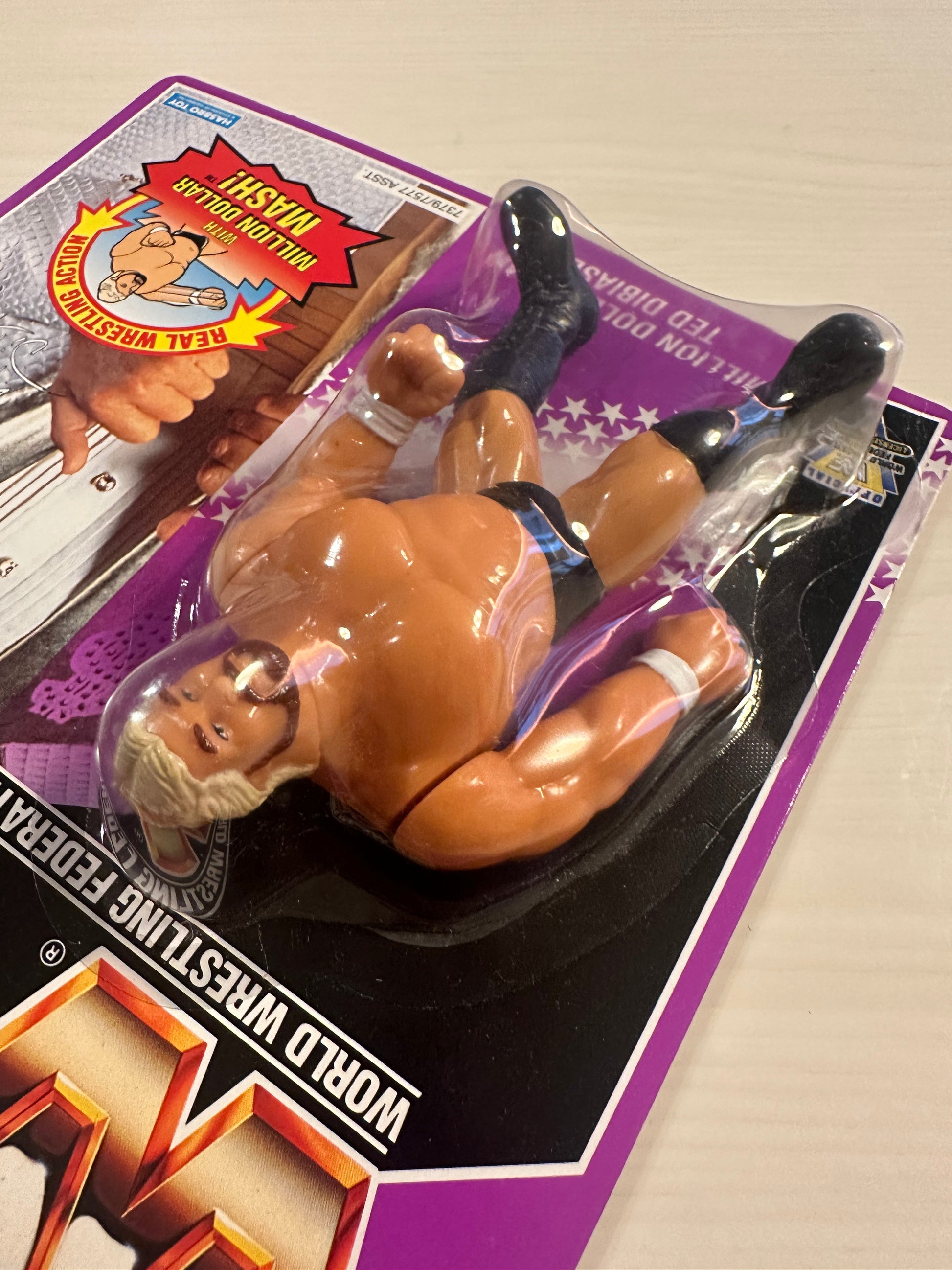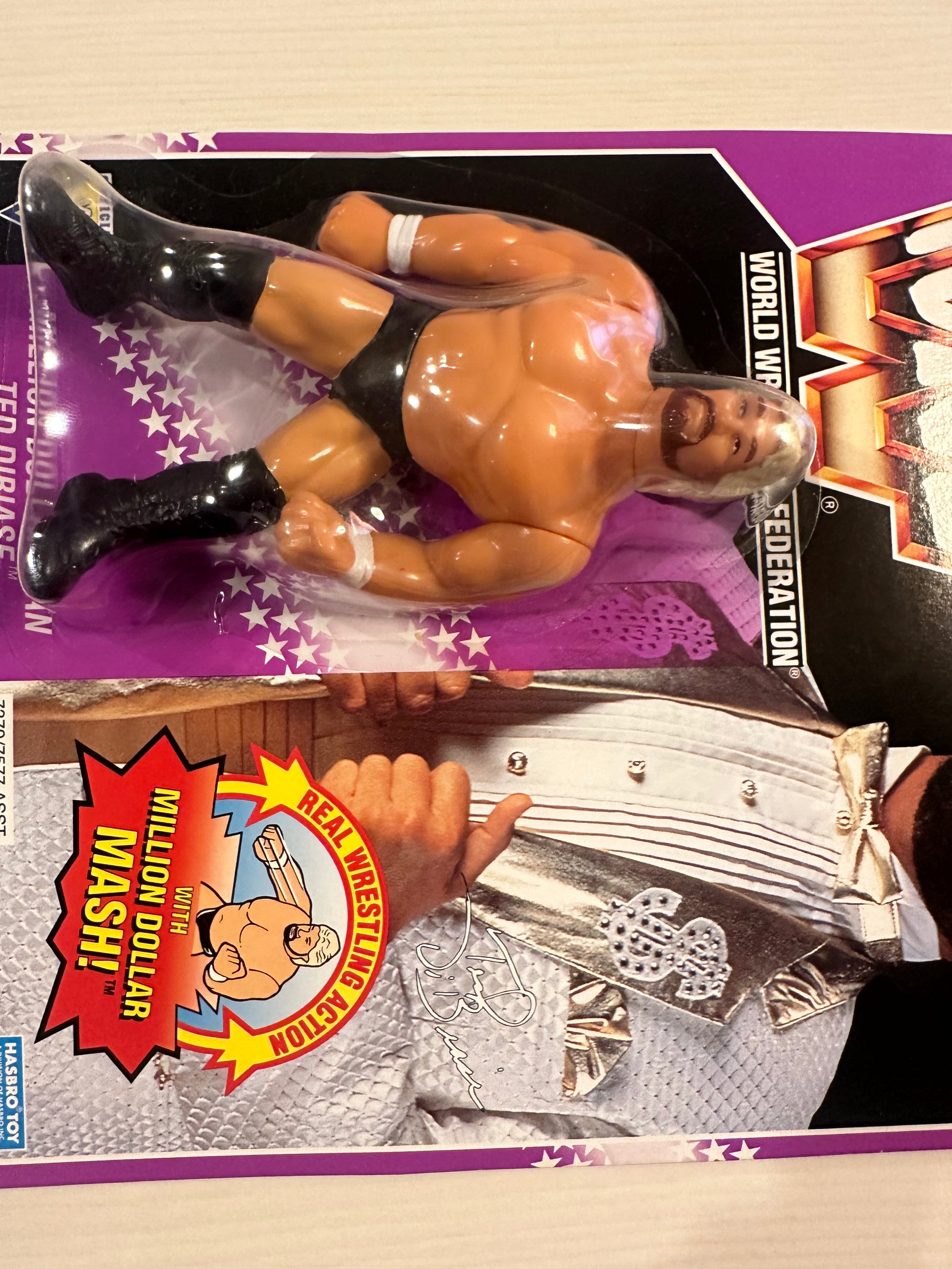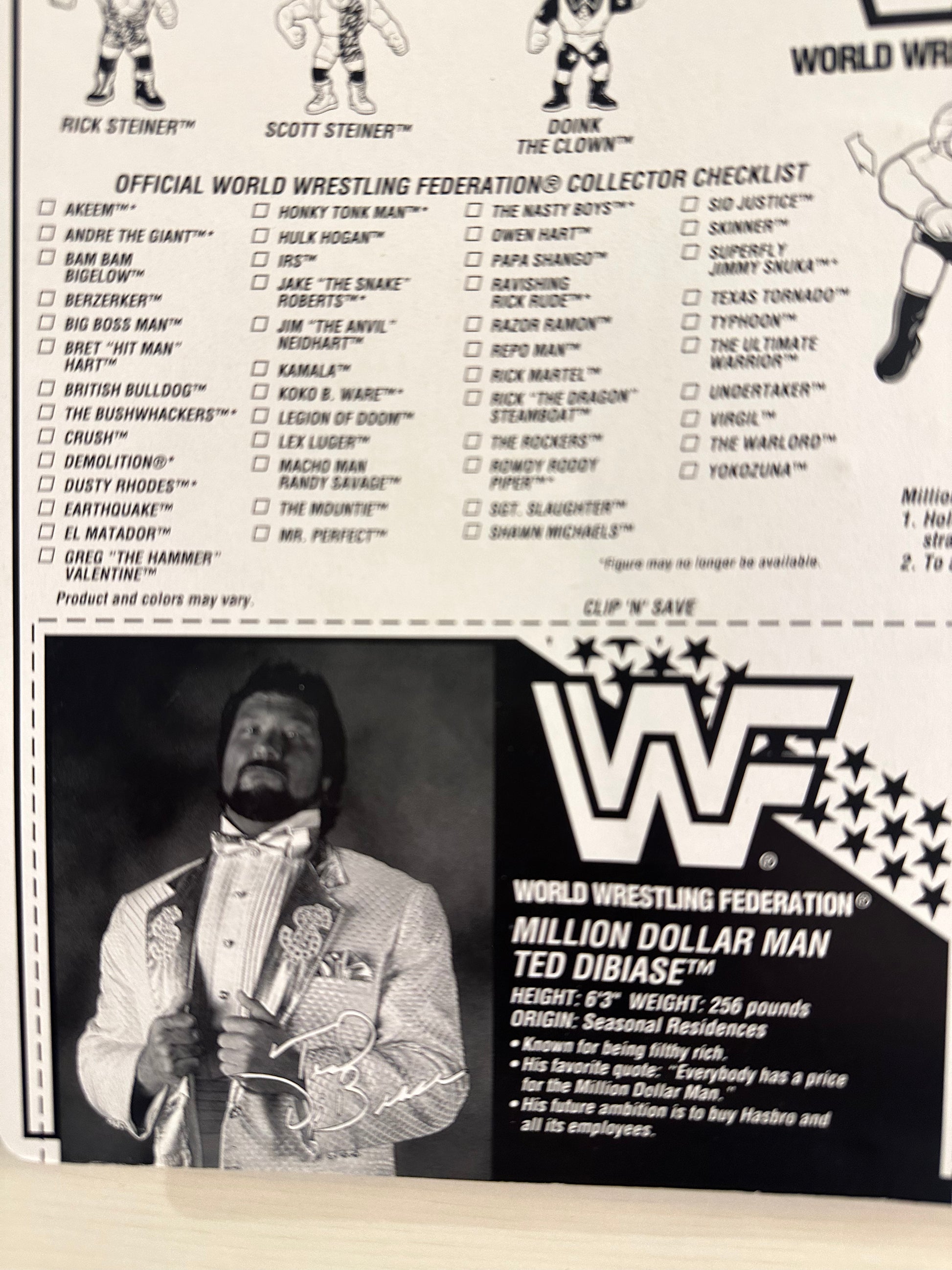 MILLION DOLLAR MAN SERIES 9 (PURPLE CARD) WWF HASBRO MOC MINT ON CARD UNOPENED WWE WRESTLING ACTION FIGURES - A nice condition Ted Dibiase figure, some minor folding in the card but the bubble is in good shape and firmly secured to the card. Free worldwide shipping! Please contact us if you have any questions about this figure, using the button at the bottom right corner of the site.