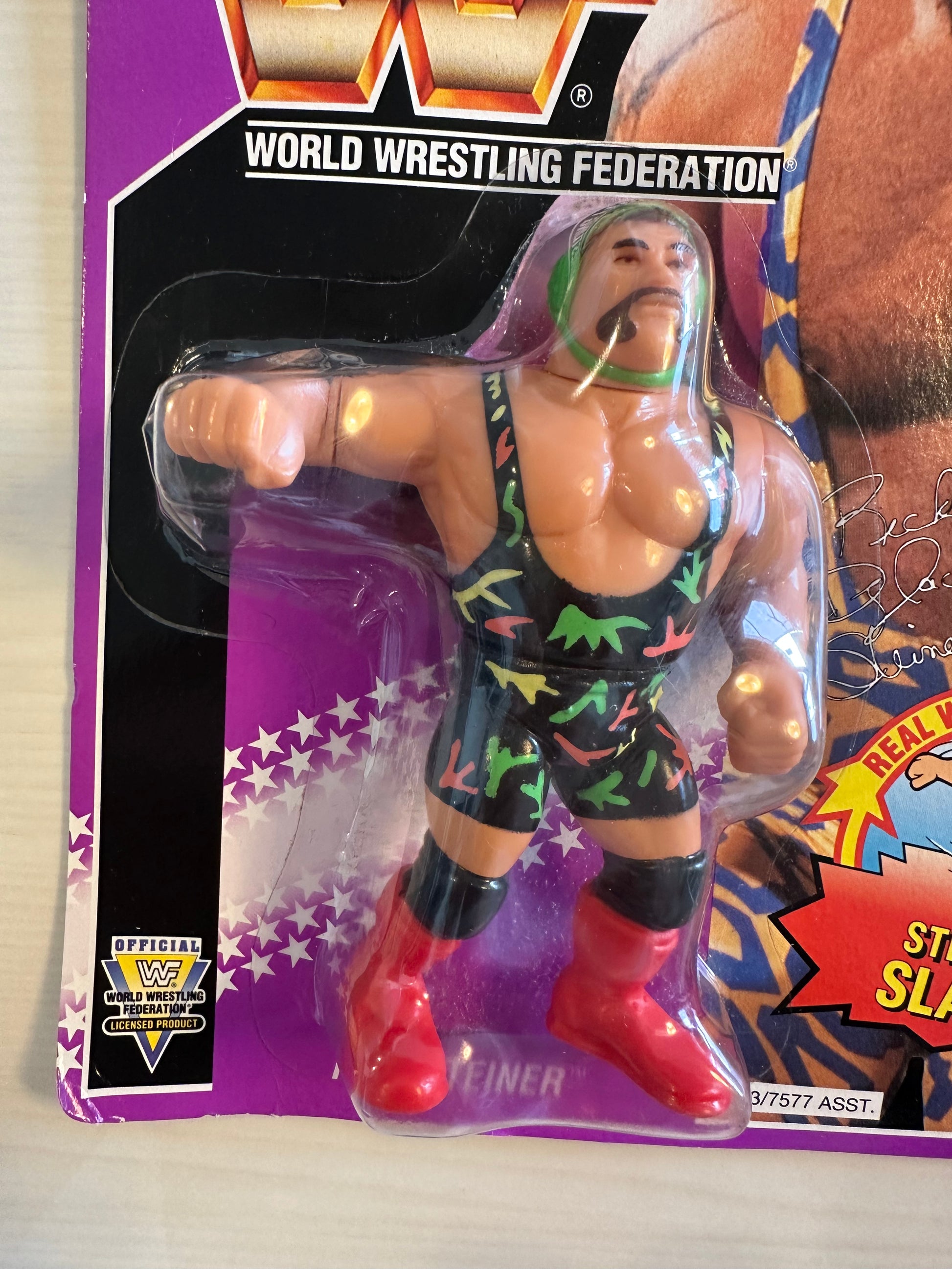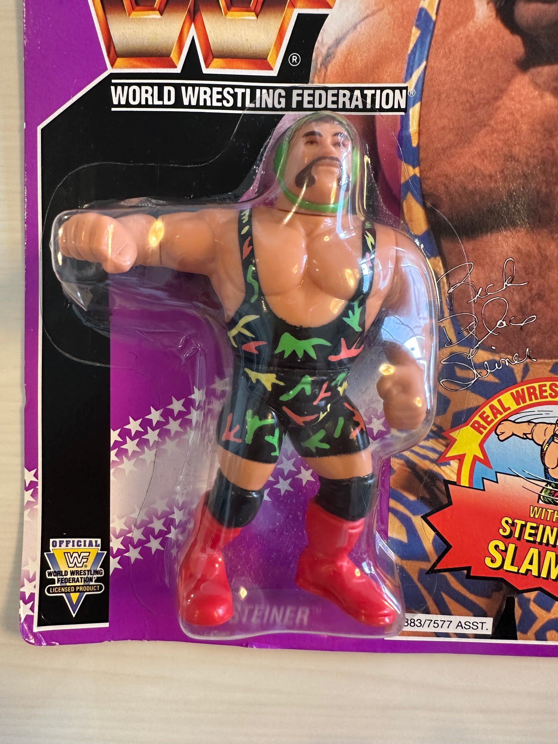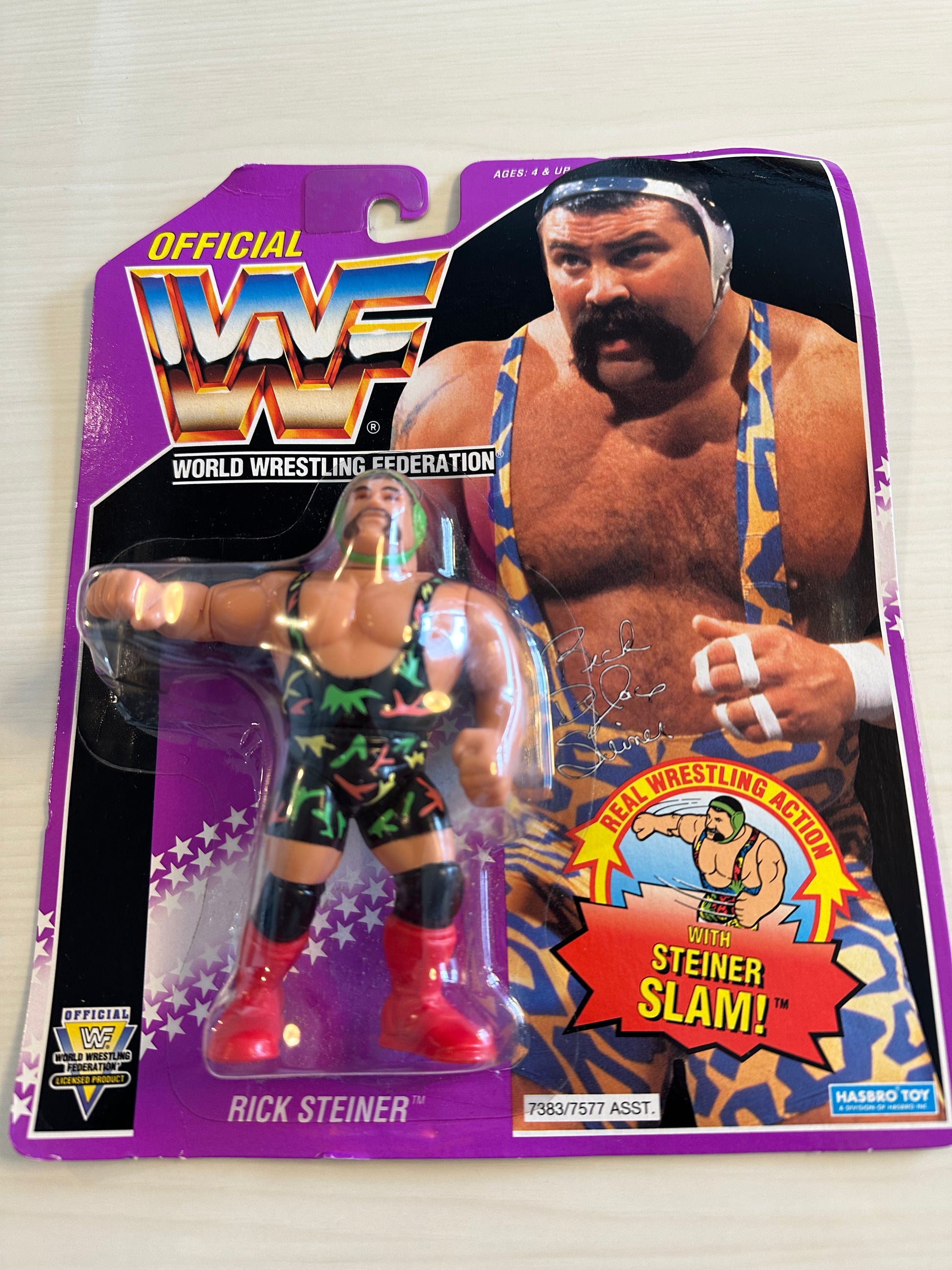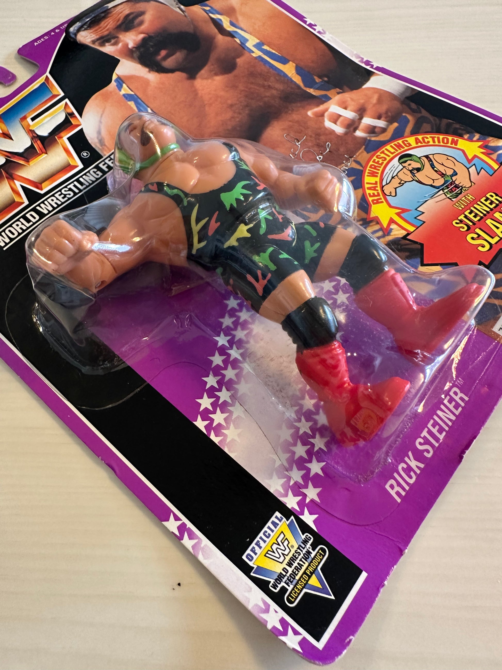 RICK STEINER SERIES 9 PURPLE CARD WWF HASBRO MOC MINT ON CARD UNOPENED WRESTLING ACTION FIGURE - Despite some minor folding at the edges of this Rick Steiner card, the bubble is firmly secured to the card. There is a dent in the bubble by Steiner's fist. Please check the images closely before purchase. Free worldwide shipping! Please contact us if you have any questions about this figure.