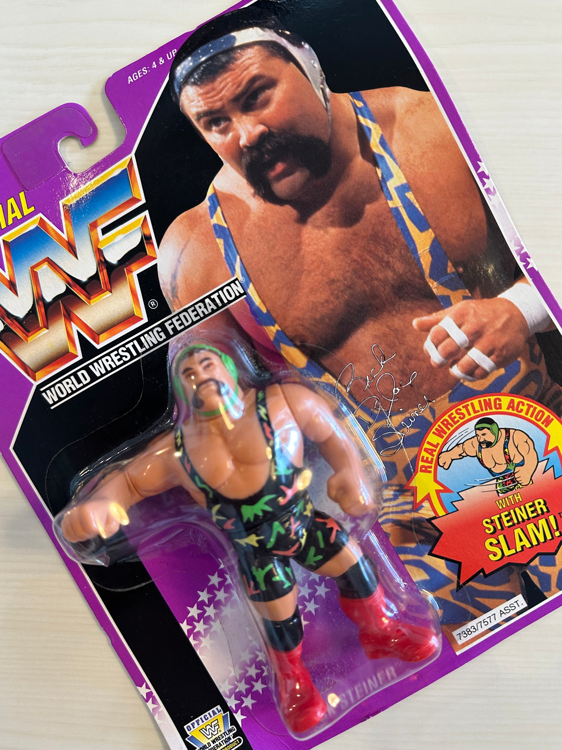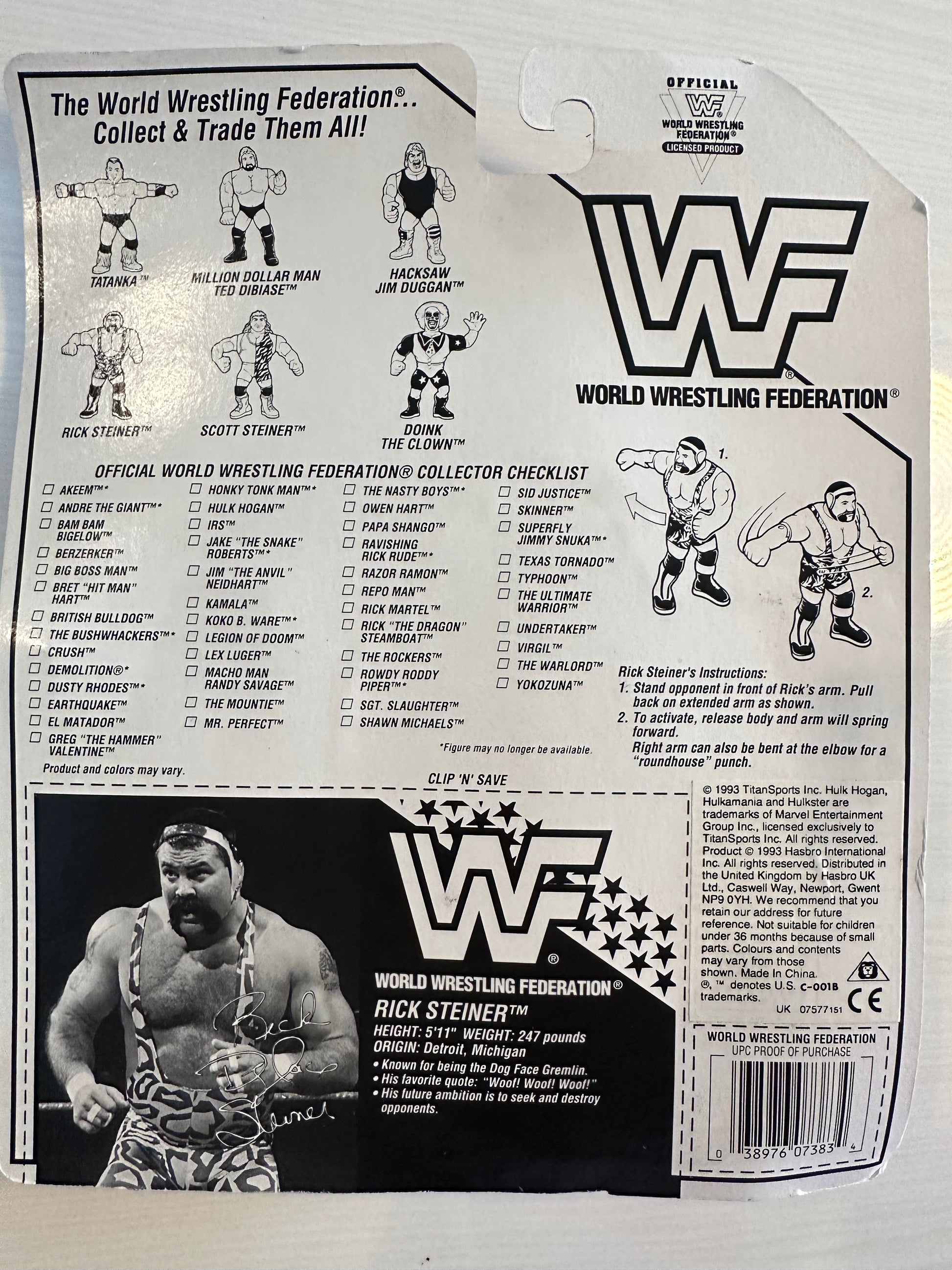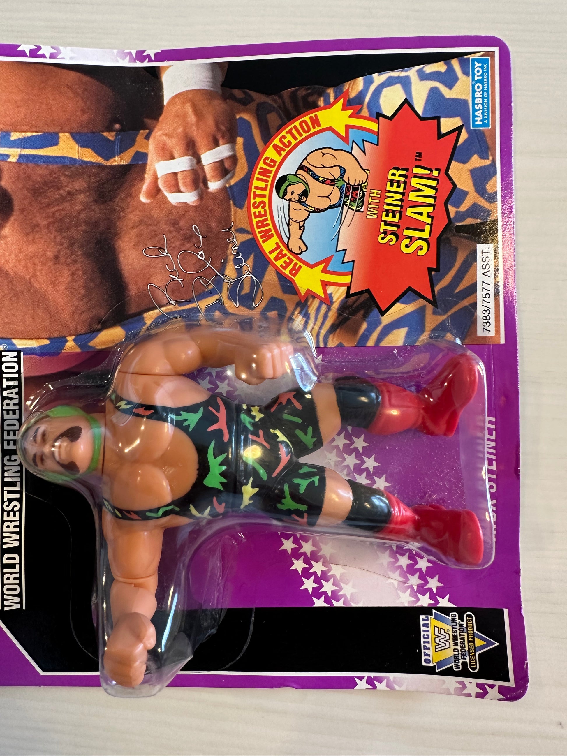 RICK STEINER SERIES 9 PURPLE CARD WWF HASBRO MOC MINT ON CARD UNOPENED WRESTLING ACTION FIGURE - Despite some minor folding at the edges of this Rick Steiner card, the bubble is firmly secured to the card. There is a dent in the bubble by Steiner's fist. Please check the images closely before purchase. Free worldwide shipping! Please contact us if you have any questions about this figure.