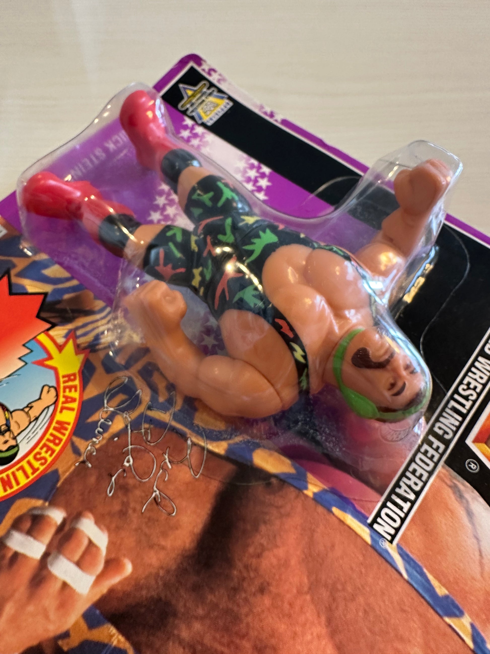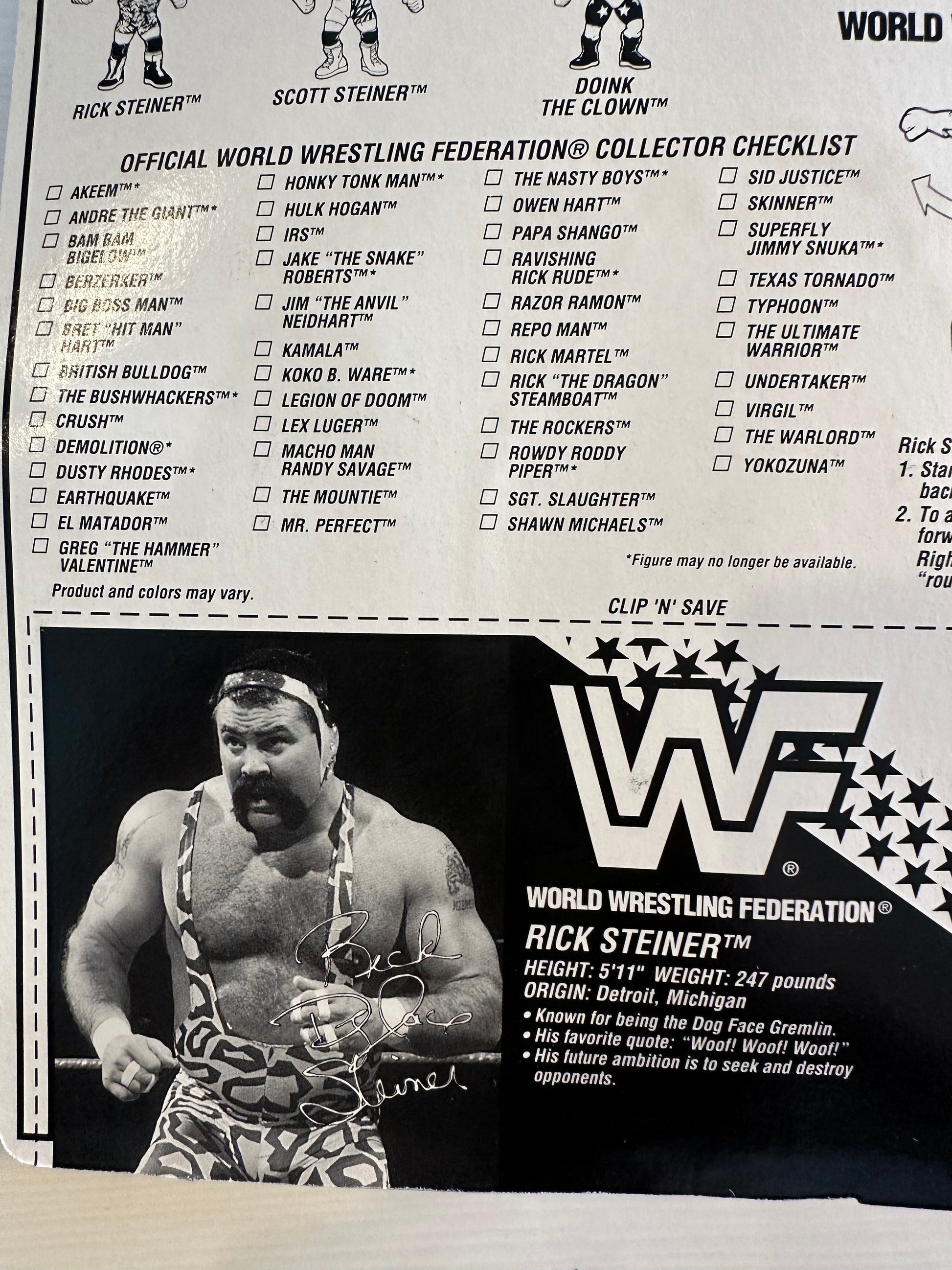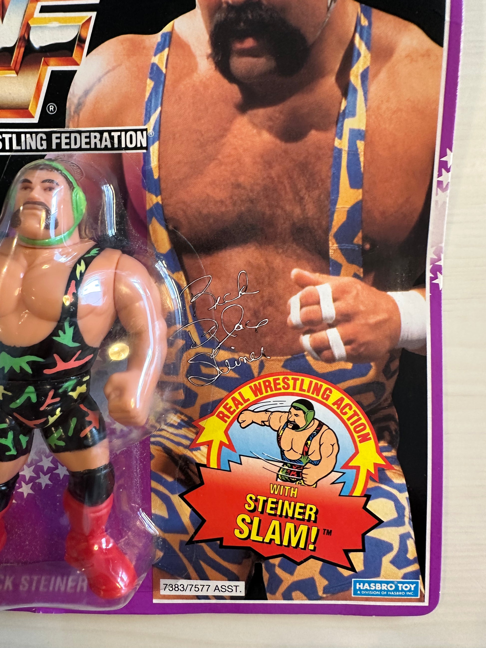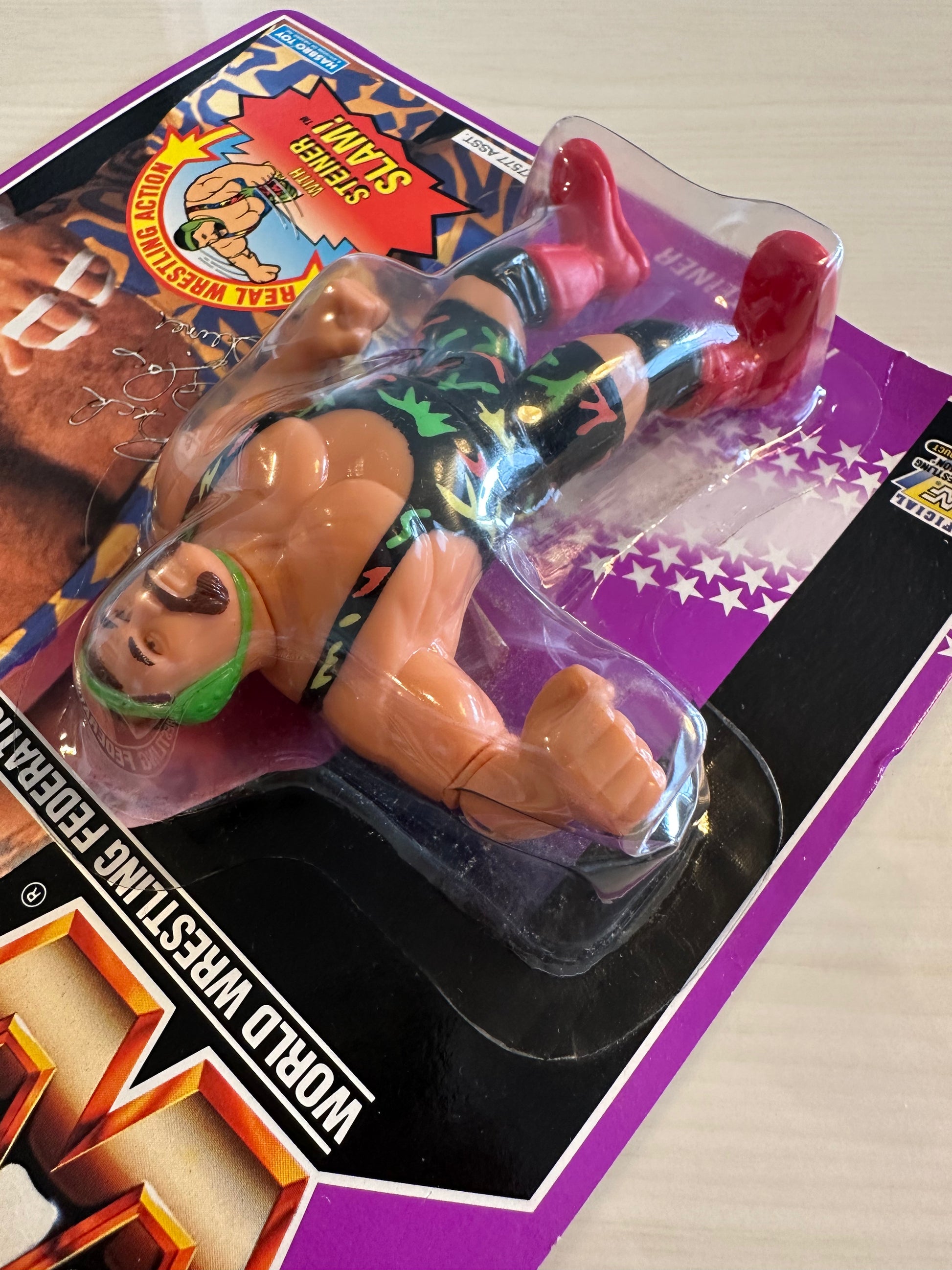 RICK STEINER SERIES 9 PURPLE CARD WWF HASBRO MOC MINT ON CARD UNOPENED WRESTLING ACTION FIGURE - Despite some minor folding at the edges of this Rick Steiner card, the bubble is firmly secured to the card. There is a dent in the bubble by Steiner's fist. Please check the images closely before purchase. Free worldwide shipping! Please contact us if you have any questions about this figure.